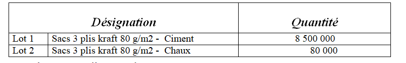 La société les Ciments de Bizerte se propose de lancer un appel d’offres national en vue d’établir un marché annuel pour son approvisionnement en sacs d’emballage de grande contenance en papier kraft normal répartis en deux (02) lots comme suit :